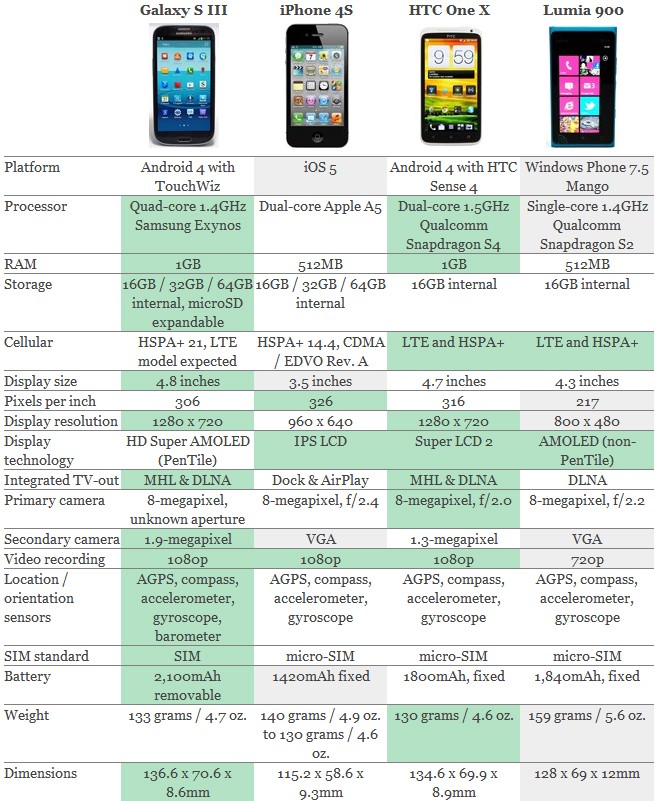 Ecco le differenze hardware e software tra il nuovo Galaxy S III, l’HTC One X, il Nokia Lumia 900 e l’iPhone 4S: